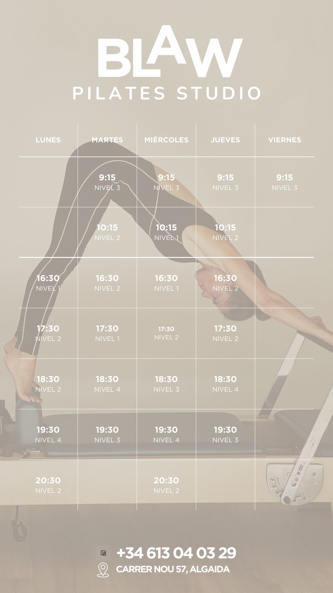 Encuentra el horario y nivel que más se adapte a tí. Inscribete ya y ven a descubrir una nueva forma de mantener tu equilibrio corporal mientras te pones en forma con BLAW Pilates
